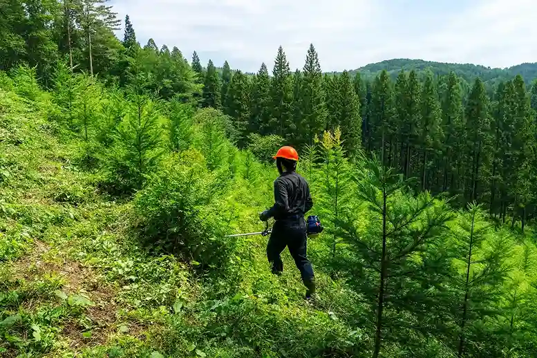 苗⽊の成⻑を妨げる原因となる雑草や不要な新しい⽊々を丁寧に刈り取り、苗⽊が健康に育つ環境を整えます。
